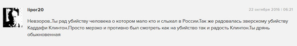 P.S. В комментах там, как обычно, прелестный паноптикум. Невзоров также радовалась зверскому убийству Каддафи Клинтон, а Иван Грозный был более лучше образован, чем Невзоров. Чувачки зажигают.