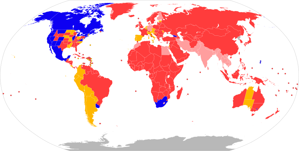 жёлтым - с декриминализацией обладания и употребления, розовым - трава нелегальна, но за обладание и курение, как правило, не наказывают.
