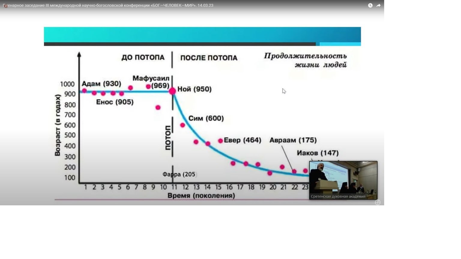Директор Института общей генетики имени Вавилова Российской академии наук, член-корреспондент РАН Александр Кудрявцев заявил со ссылкой на некий «график из интернета», что раньше люди жили по 900 лет, но потом продолжительность жизни сократилась из-за «первородного греха». Он выступил с докладом на пленарном заседании III Международной научно-богословской конференции «Бог — человек — мир» в середине марта, внимание на запись СМИ обратили только сейчас.