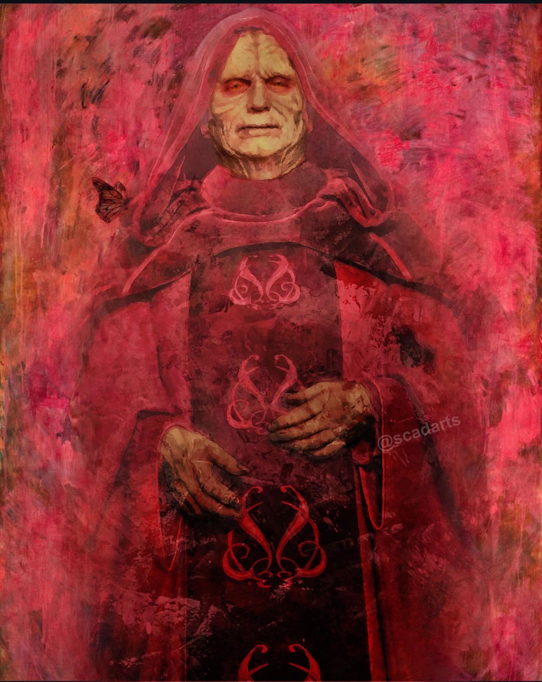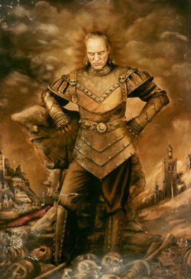 По-моему, классная картина, очень подходит к 21 веку. Она очевидно про Апокалипсис: король стоит на фоне пылающего пламени войны, и сам из него соткан. Военная форма — это не парадный наряд здесь, а тоже часть пламени. Опирается он не на тросточку, а на меч — полезный атрибут героя в любых картинах про войну. Над плечом у него витает бабочка, не знаю, какой смысл там вкладывал художник, но вообще по дефолту, это чья-то душа: очевидно, мамы его.