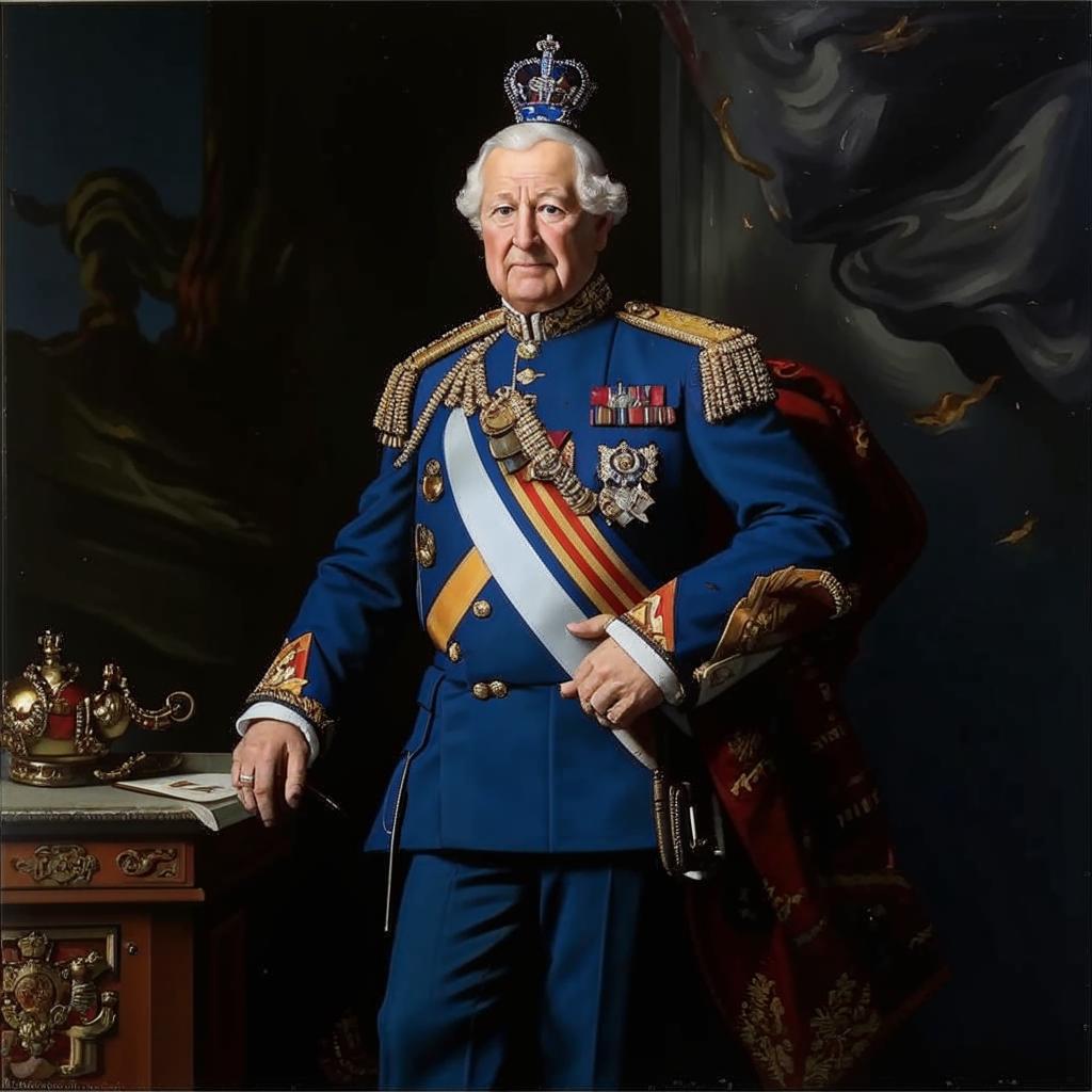 Впрочем, Сафронов и писать бы его не стал, конечно. Он, как обычно, сделал бы фото, обработал на компе и распечатал бы на холсте, как он делает практически со всеми своими работами. Ну и понятно, что Чарльз III был бы у него изображен не в в форме Уэльской гвардии, а образе какого-нибудь античного героя. Да того же Путина, например. Это была бы бомба: король Чарльз III в путинском пиджачке, в коротковатых брючках и ботиночках на здоровенных, тщательно скрываемых каблуках.