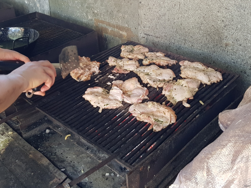 Пошла закладка первой партии. В "Меркадоне" продаются упаковки из двух куриных ног без костей. Серхио их маринует в луке, перед готовкой споласкивает в воде, чтобы очистить от лука (иначе он будет подгорать), и жарит на решетке.