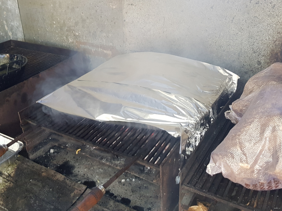 Фирменное ноу-хау - один раз курицу перевернуть, после чего накрыть фольгой. Получается что-то вроде веберовской угольной барбекюшницы: и курица равномерно подрумянивается с двух сторон, и открытого огня от стекающего жира не будет.