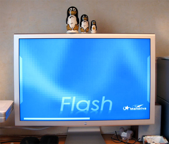 На фотографии нифига не видно, что оно виснет 😉 На фото пингвины на мониторе с довольно дикой загрузочной заствкой мандривы.