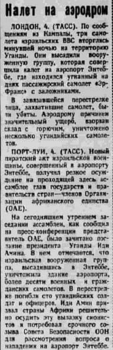 В советской прессе эту спецоперацию израильтян назвали "пиратским актом израильской военщины" и, конечно же, решительно осудили.