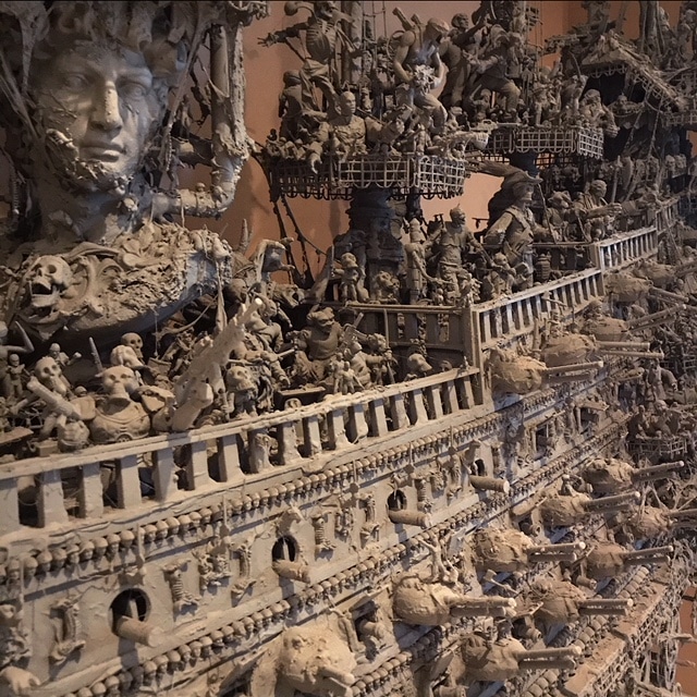 Татуировщик Джейсон Стиева (вот его Инстаграм) в свободное время увлекается созданием различных причудливых скульптур, которые он делает из деталей старых разобранных часов и других предметов, приобретаемых Джейсоном на барахолках и блошиных рынках. (Источник - "Artist Spends 15 Months Constructing Ghostly Pirate Ship With Ordinary Found Materials".)