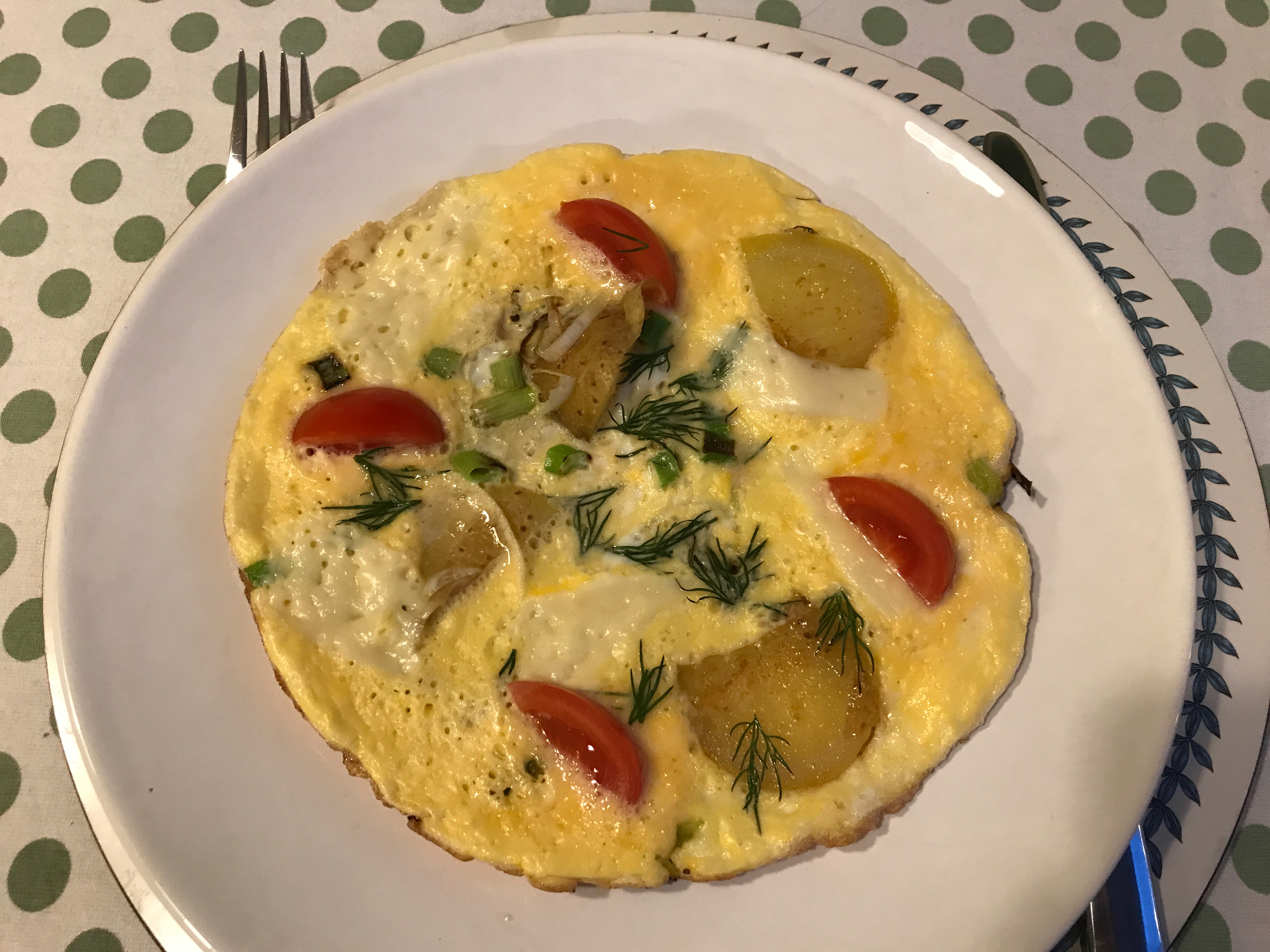 Каждое утро готовлю такой омлет из двух яиц, зелени, черри и сыра порезанного тонкими плстинами. В это раз ещё добавилась вчерашняя картофелина ))