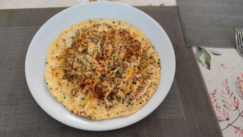 Сделал. Два яйца, немного молока, как следует все перемешал, налил на сковородку оливкового масла, влил туда яйца, поставил готовиться на небольшом огне. Омлет посолил, поперчил, ну и в плане пищевой креативности посыпал сухим чесноком, сухой петрушкой и базиликом, также острой паприкой и кайенским перцем.