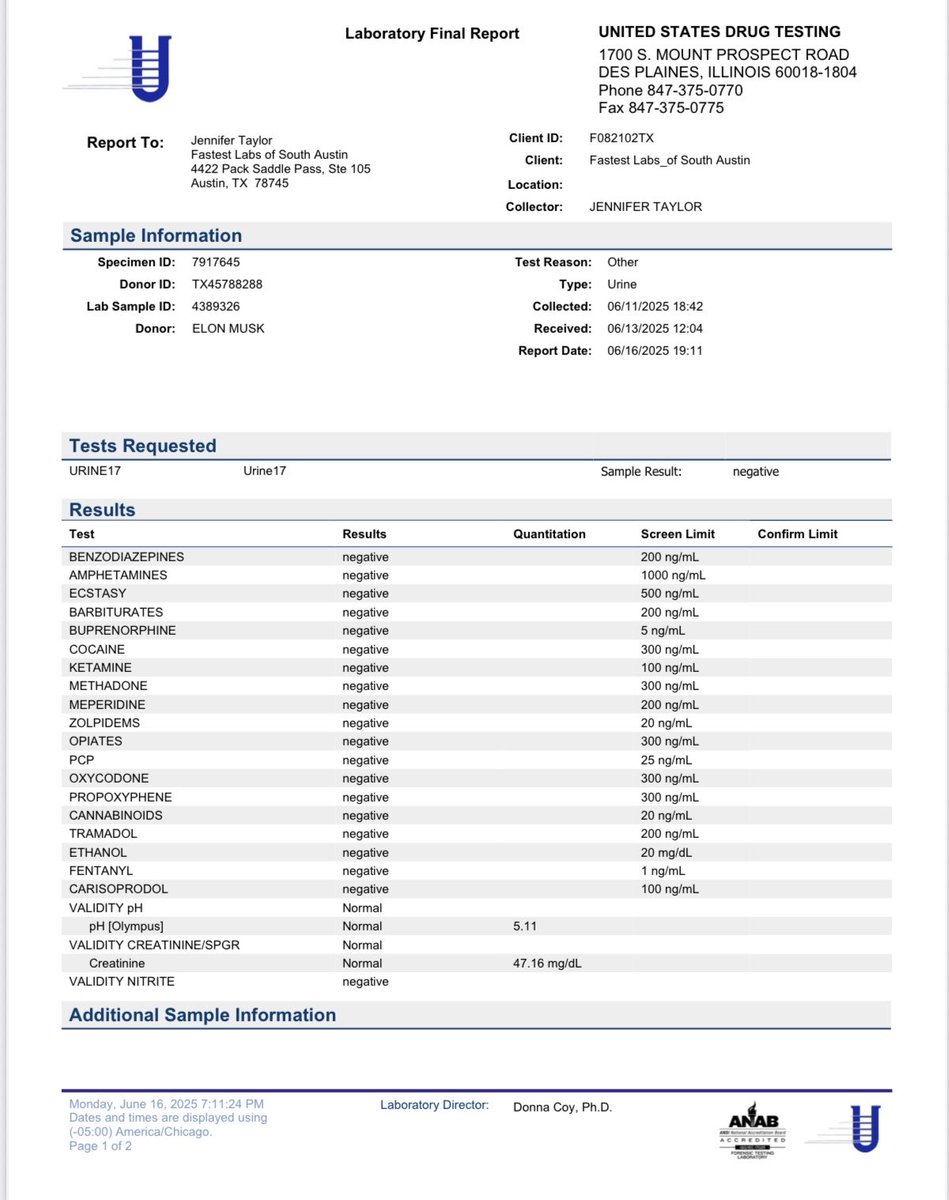 Маск тем временем показал результаты своего теста на наркотики. Все негативно. Что исключает их постоянный прием.