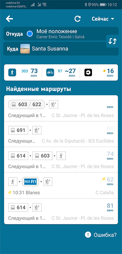 Upd: У нее список поддерживаемых городов почему-то небольшой, но на самом деле в той же Испании она прекрасно знает маленькие городки и строит маршруты, причем вполне правильно. Вот, например, варианты из нашего городка в городок через один от нас. Все четко показывает, включая точные адреса остановок автобусов.