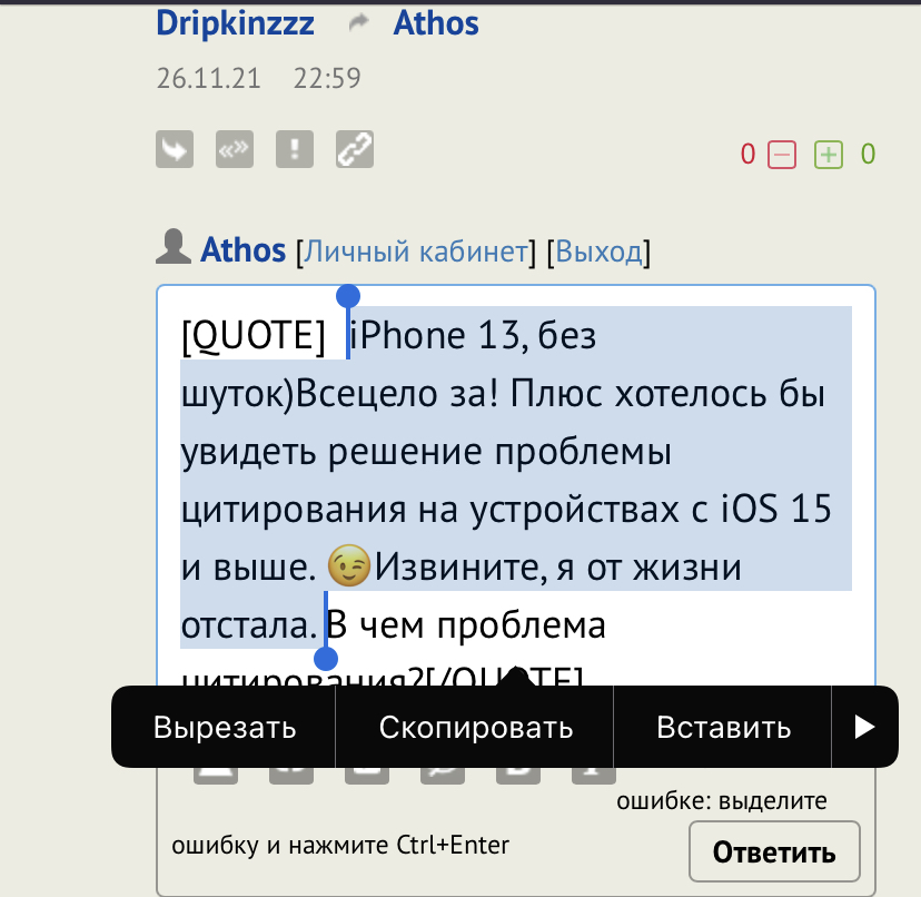 Плюс хотелось бы увидеть решение проблемы цитирования на устройствах с iOS 15 и выше. ?