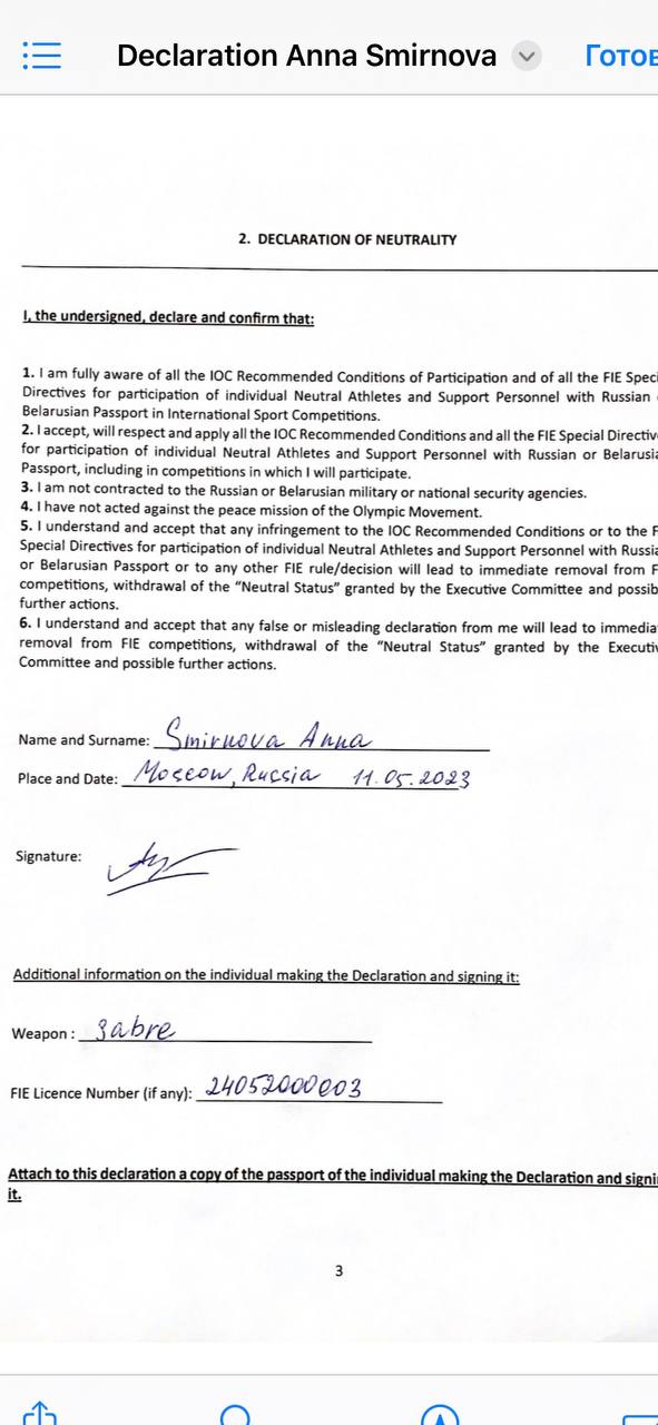 Но дальше стало совсем интересно. Дело в том что еще со времен коронавирусного дурдома существовало правило, которое разрешало не пожимать руки после поединка, а позволяло просто скрещивать опущенные сабли - что и пыталась сделать Ольга Харлан. И еще утром в день матча и Ольге, и ее тренеру руководство Международной федерации фехтования подтвердило, что это правило действует, и так поступать вполне правомочно. (Да и, собственно, на данном турнире были и другие спортсмены, которые именно так завершали поединок.) Об этом говорила и сама Ольга, и ее тренер. Более того, они утверждают, что Анна Смирнова и ее тренер были предупреждены о том, что после поединка вместо пожимания рук будет процедура скрещивания сабель.