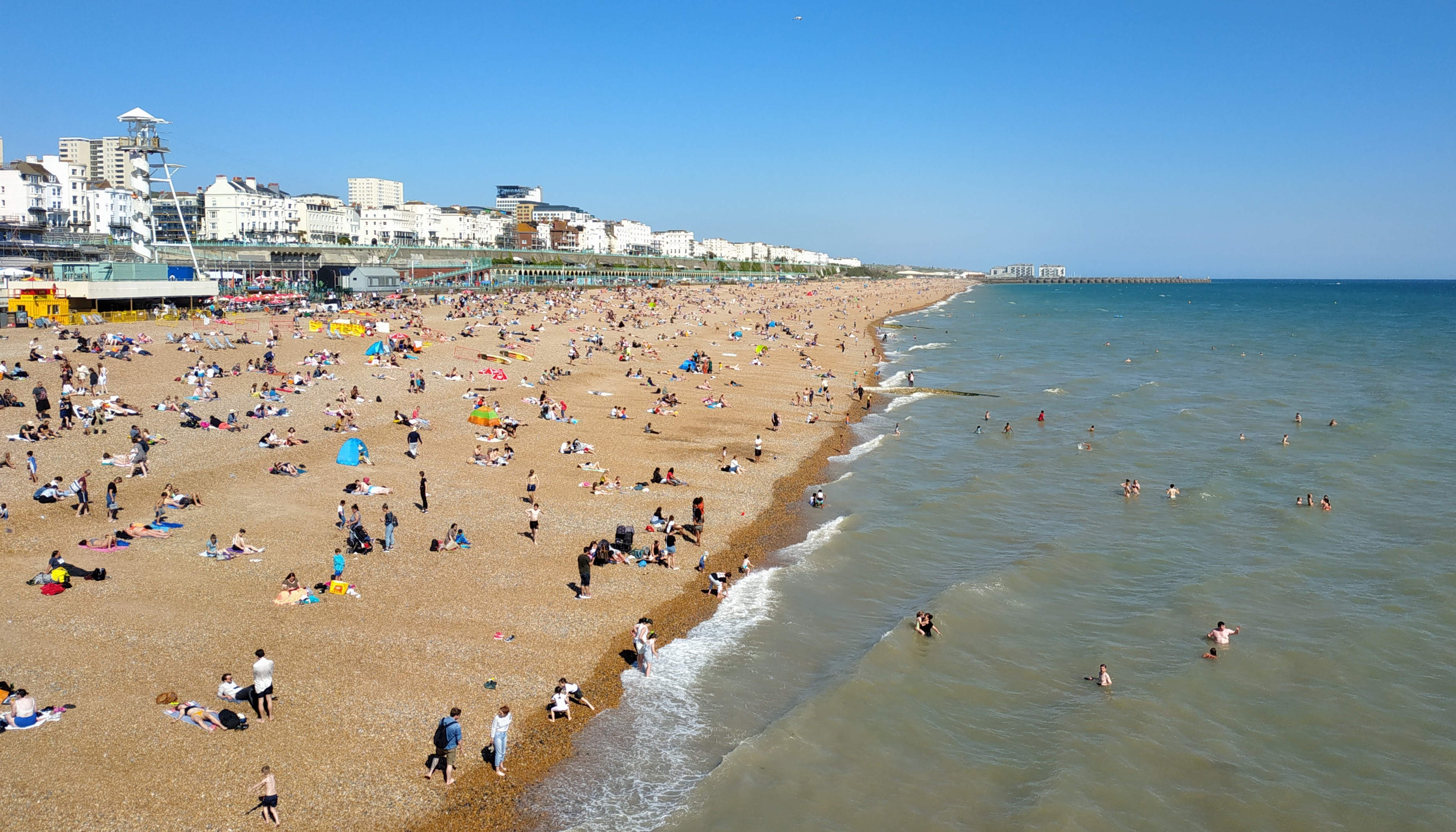 Это сегодня в Брайтоне. Людей в воде пока не так много по понятным причинам, но рестораны все забиты.