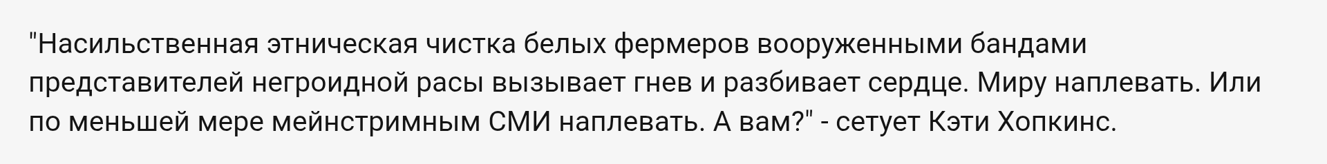 Преследования белого населения Африки продолжаются вот уже более пятидесяти лет. Это достаточно систематическая политика — в той мере, в какой постколониальные правительства Чёрного континента вообще способны на систематичность. Тут можно вспомнить много чего: и то, как бывшую Родезию превращали в нынешнее Зимбабве, и деградацию Уганды, и распад Сомали, и... да мало кто из тамошних стран избежал этого.