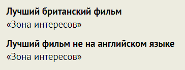 "Оппенгеймер" получил аж семь наград, включая приз за лучший фильм. На втором месте по наградам - "Бедные несчастные". Ну и приятно, что без наград не остались "Оставленные" и "Анатомия падения", а "20 дней в Мариуполе" получил премию как лучший документальный фильм.