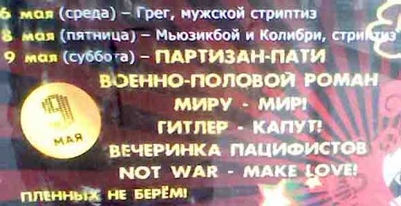 А по-моему, дискотека под пацифистскими лозунгами куда более достойный метод отметить День Победы, нежели бряцание оружием на Красной площади.