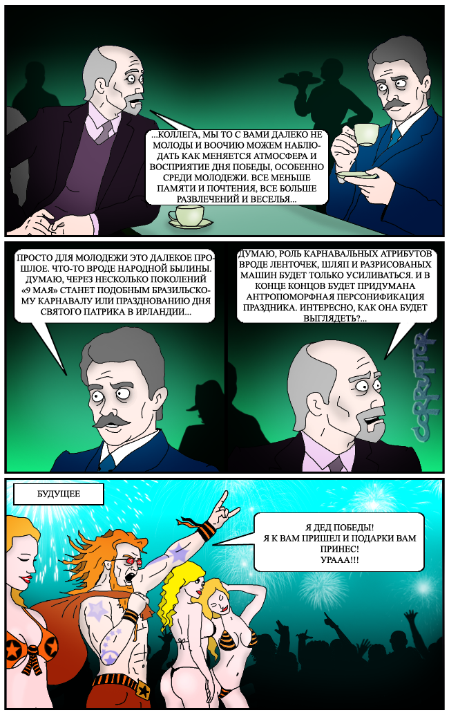 Пошлость. Всепроникающая, не знающая никаких границ. Торты с марципановыми партизанами, голые студенты, раскрасившие тела в военные сюжеты, "Ночные волки" с косметичками, тапочки из георгиевских лент - весь этот трэш и угар, о котором, надо отдать должное, и помыслить невозможно было в советские времена. Победа была тогда пропагандистским материалом, но материалом для тапочек - нет, не была. И вещал про нее что-то пропагандистское безукоризненный Игорь Кириллов с мхатовской речью, а не, прости Господи, Залдостанов.