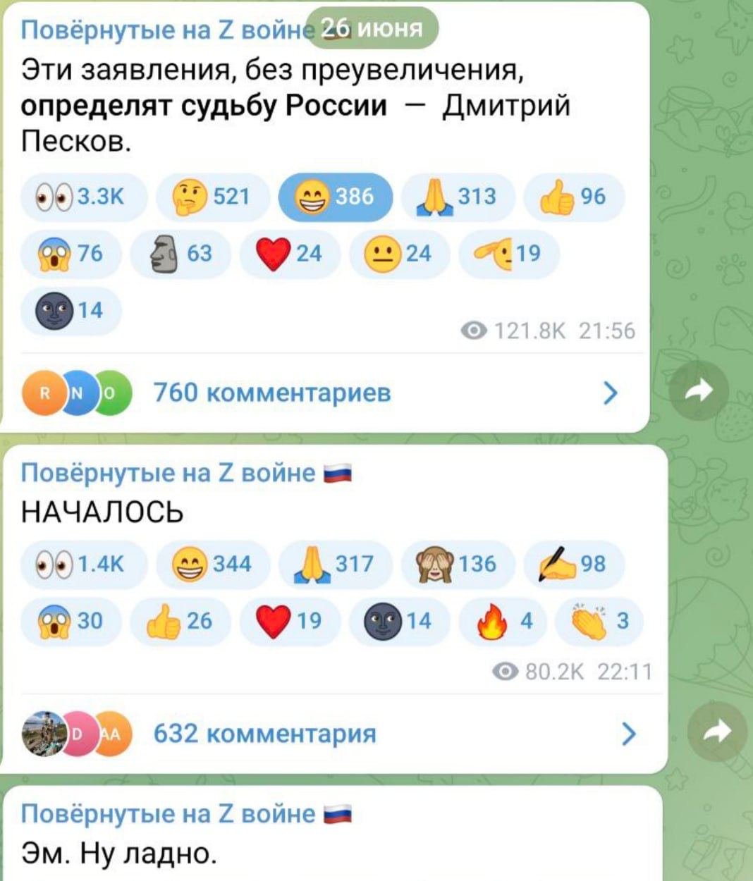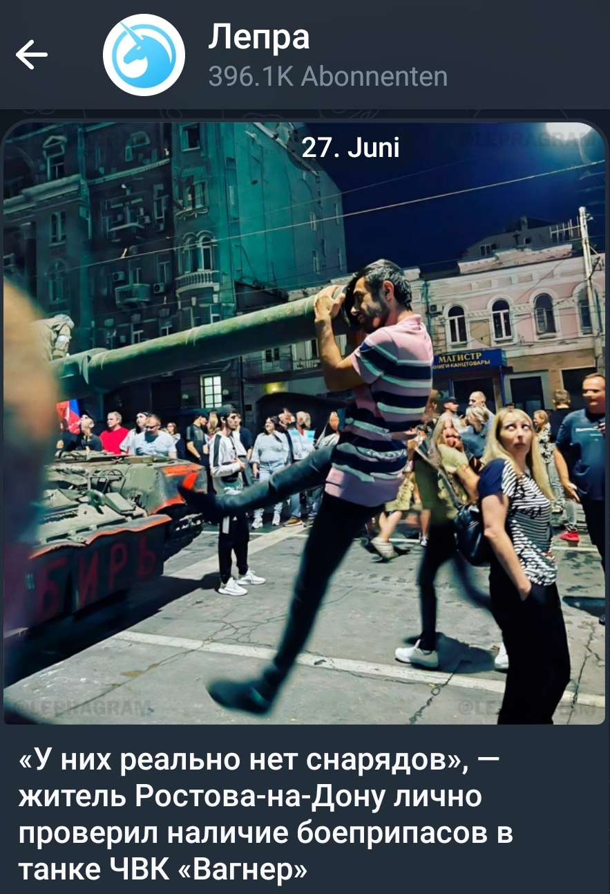Кстати, я читал, что в оригинале обращения прозвучали слова "Дорогие друзья, сегодня еще раз обращаюсь к вам", однако в выложенном в Rutube ролике, откуда я его и взял, начало явно обрезано. Видимо, было записано и другое, в полном смысле слова судьбоносное обращение, но решили пока просто поблагодарить мятежников и разрешить им заключить контракт с Минобороны.