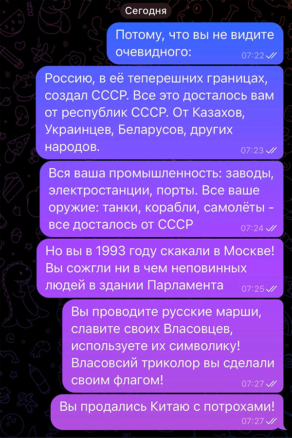 Поэтому совершенно бессмысленно говорить с ватой, искать аргументы, переубеждать.
