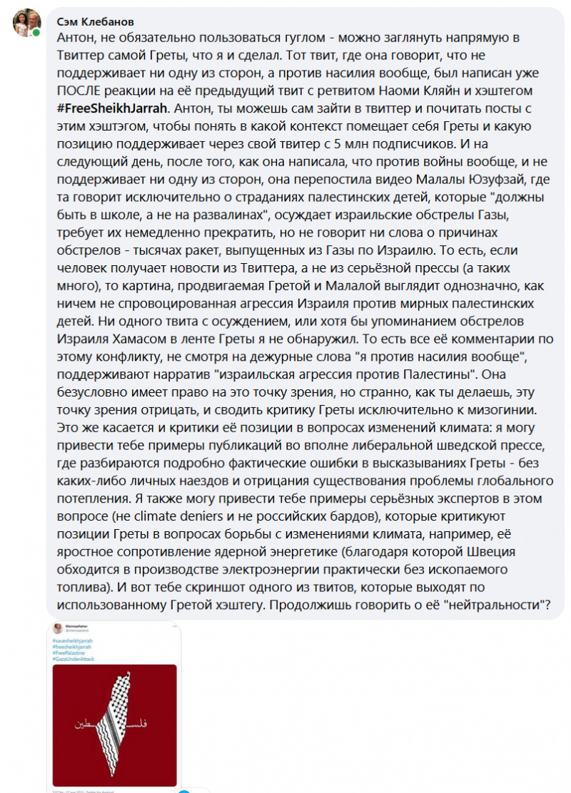 При этом Гугл находит единственный твит Греты со словами в духе «я ни на чьей стороне, я просто хочу, чтобы не было войны». Вообще ни одной ссылки или цитаты в этом немецком тексте нет - только пространный пересказ того, какая Грета ужасная. Как главный ее грех приводится перепост (!) твита Наоми Кляйн. Которая вообще-то взрослая и весьма популярная тетя (в России издано несколько ее книг). Однако при этом наезжают, конечно, не на неё. И не на Роджера Уотерса, громящего Израиль страшными словами (это как-то не мешает россиянам обожать Pink Floyd и ходить на его концерты). И не на десятки других взрослых, авторитетных, популярных защитников Палестины и ненавистников Израиля. А именно на Грету. Которой 18 лет. И которая не политик, не руководитель чего-либо, а просто эко-активистка, пусть действительно и популярная (но не Pink Floyd).
