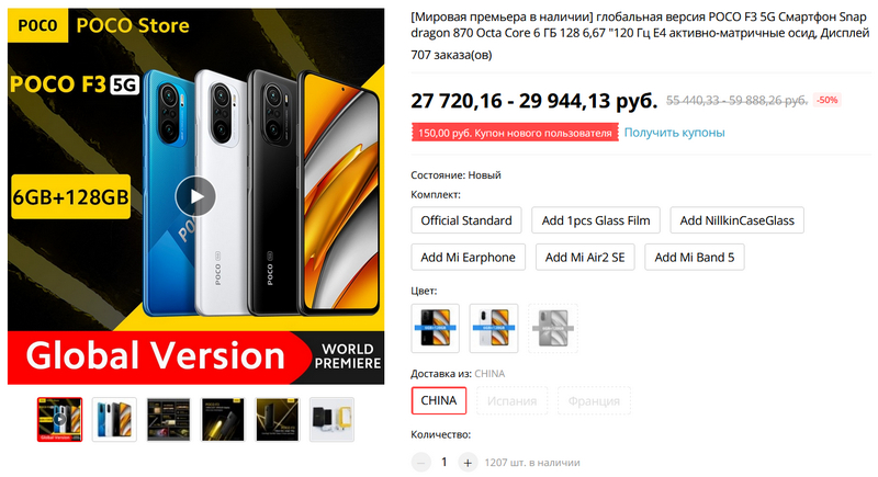 Также меня спрашивали, буду ли я тестировать новую модель Poco F3 5G - она вот только что появилась в продаже на Ali, версию 6/128 ГБ можно купить за 27 тысяч рублей.