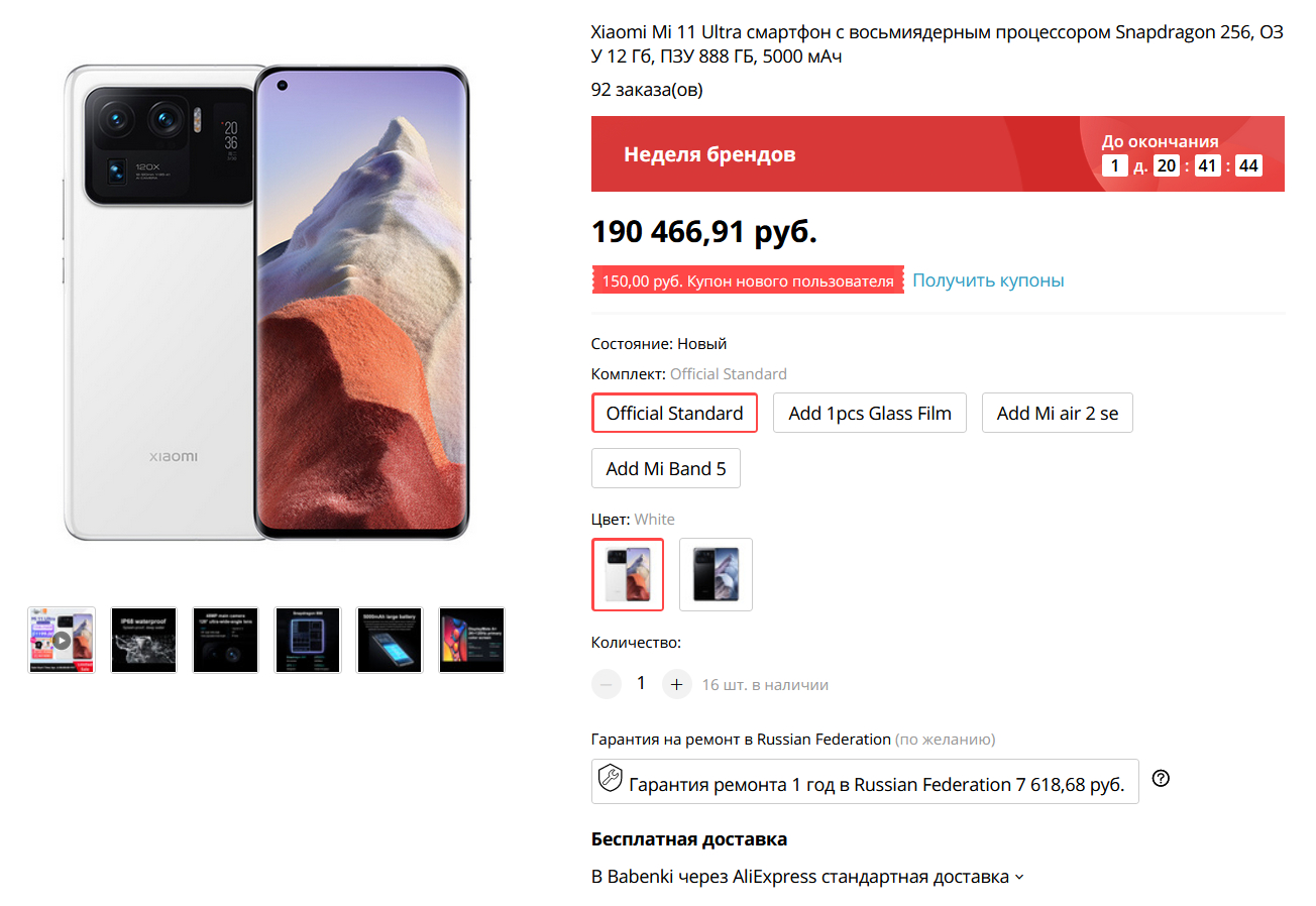 Модель получила беспрецедентный ценник - 1199 евро. Если вы готовы заплатить такие деньги за свеженький флагман Xiaomi, это можно сделать на AliExpress. В 10:00 по Москве стартуют первые продажи Mi 11 Ultra с ценником $1199 (немножко дешевле официально озвученного ценника на глобалку). Доступны два цветовых варианта - черный и белый. Конфигурация памяти представлена только версией на 12/256 ГБ.