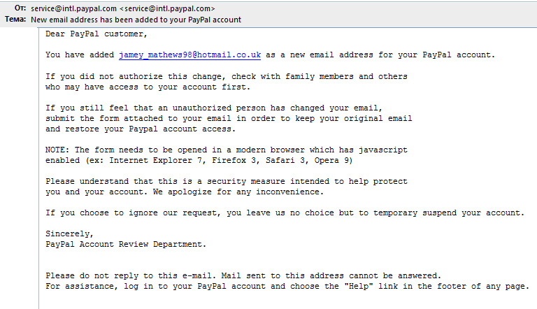К письму приложена HTML-форма, которую нужно заполнить, чтобы, дескать, спасти ваш аккаунт PayPal. В форму, раузмеется, нужно внести все интимные сведения, включая данные кредиток.