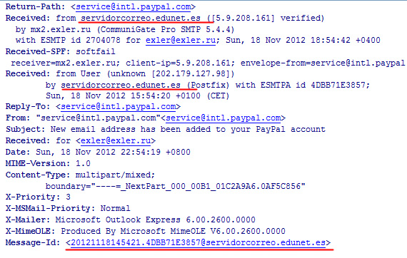 Для надежности можно просто обычным образом зайти в ваш аккаунт, чтобы убедиться в том, что никакие новые адреса там не появились. Но в данном случае и так за версту видно, что банальная подделка. Во-первых, видно, что продолбили массовой рассылкой - вы даже не указаны в качестве получателя письма. Это сразу в топку. Ну и во-вторых, если открыть служебные строки, прекрасно видно, что адрес тупо подделан, и что письмо пришло вовсе не от paypal. Не наколитесь, короче говоря.