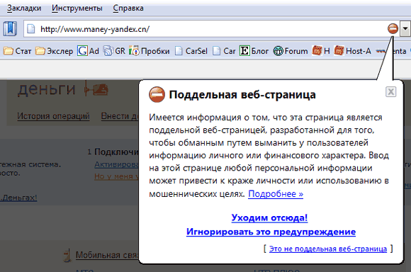 Блин, а у меня почему-то не сработала защита от фишинга, ни в фф 2.0.0.11 (хотя галка suspected forgery в security стоит), ни в ие 7 (самому пришлось настучать в ms про этот сайт).