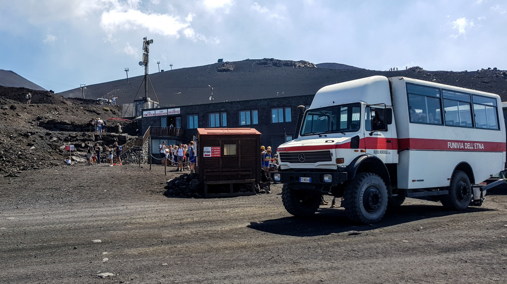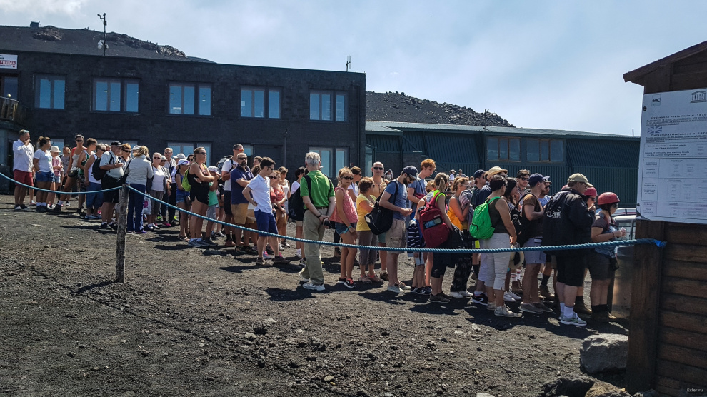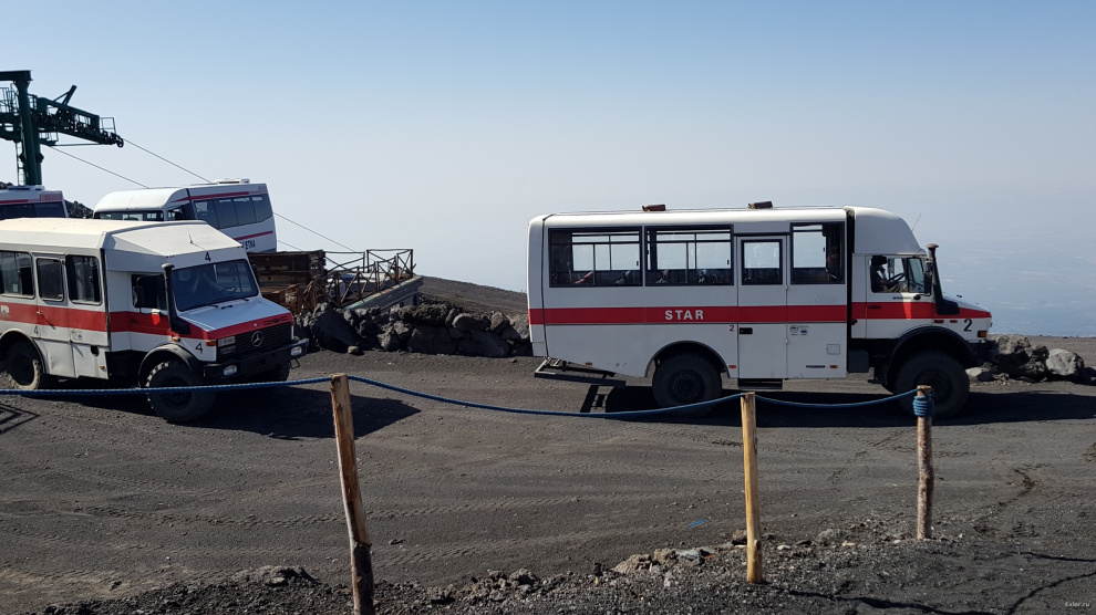 Перед подъемником небольшая очередь за билетами, но движется довольно шустро. Полный подъем, включая доставку к вершине на специалных автобусиках, обходится в 63 евро.