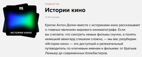 Слушаю Долина так же в подкасте "Книжный базар" с Галей Юзефович, он там в летних сезонах участвует. О кино и литературе, очень интересно. Так же советую подкаст Льва Ганкина "Шум и яркость", о саундтреках, кладезь любопытных фактов.