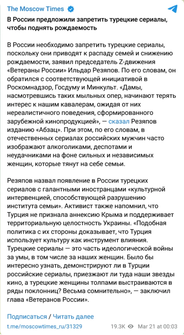 Upd: А исчо, Ладим Ладимирыч, надо турецкие сериалы запретить. Бо это тоже бабы смотрят и настоящим патриотам не дают.