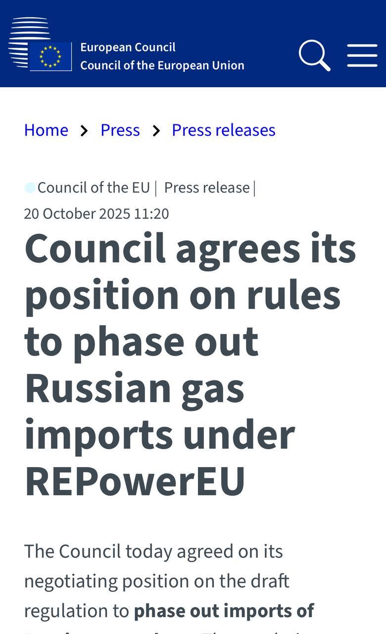 Осталось продолжать два месяца. Комитеты Европейского парламента по вопросам промышленности, исследованиям и энергетике и по вопросам международной торговли одобрили законопроект, который запрещает с 1 января 2026 года импорт российского природного газа - как трубопроводного, так и сжиженного (СПГ).