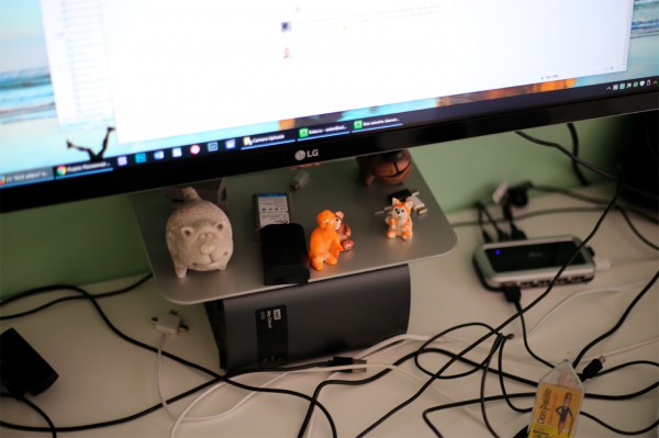 Сначала монитор у меня стоял на подставке. Но подставка была низковата, а я привык, чтобы монитор находился на уровне глаз. Надо было подложить под подставку пару книг, но так как я не держу дома аналоговые книги, роль удлинителя сыграл двухдисковый NAS.
