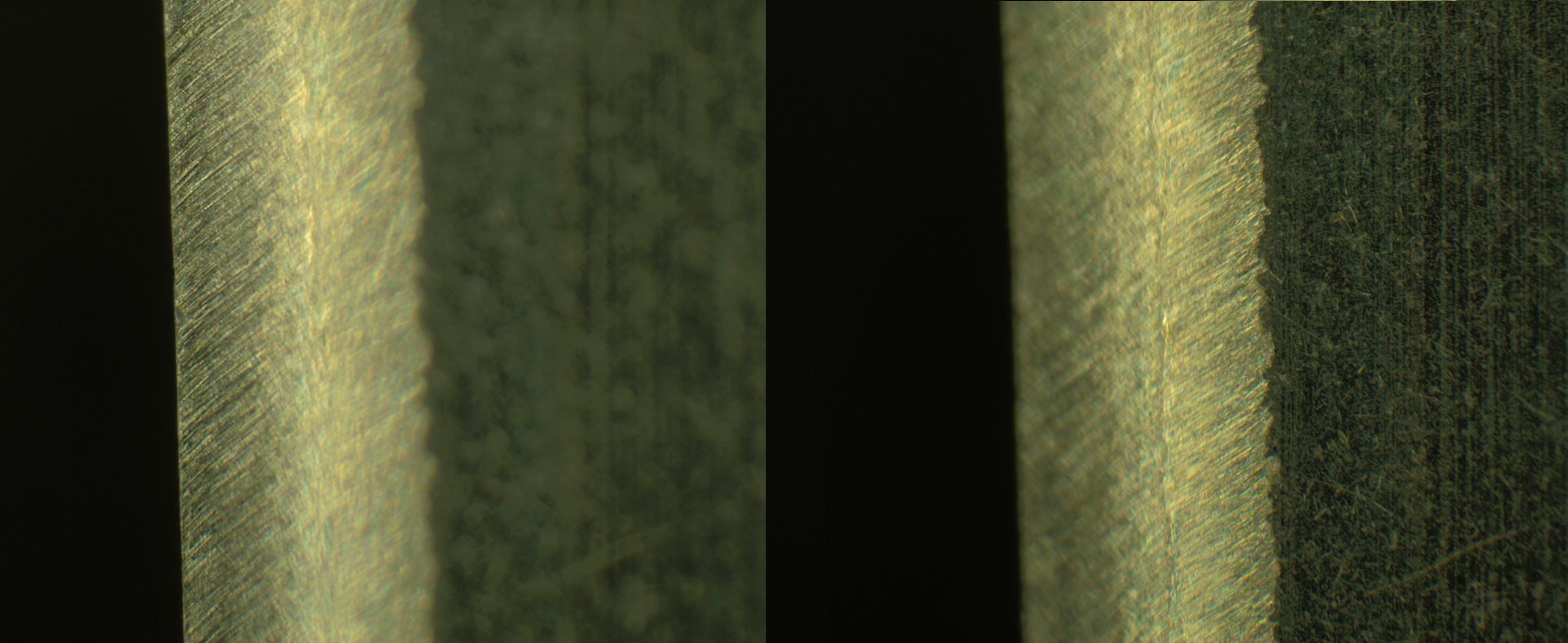 Почитал свой ответ и недоволен, не получилось внятно описать результат. Так что решил выложить фото РК своего Викса после заточки на Спайдерко. Для понимания это два фото, на одном из которых фокус микроскопа на самой РК, а на втором - на том самом спрямлении под 30 (15) градусов линии стыка РК и полотна, которое формирует эллиптический (выпуклый) профиль. Мне кажется все-таки, что ножи в основном идут с заводской заточкой 40 (20) градусов. 25 это уже хуже. И да, переточить РК с 20 на 15 градусов во-первых, не нужно, во-вторых, на Спайдерке это не удастся, только докупить два алмазных бруска дополнительно. Но они стоят некисло и необходимости нет. Бриться кухонным ножом я не планирую. 😄 Кстати, обращу внимание на ровнейшую линию РК безо всяких зазубрин и "пилы".