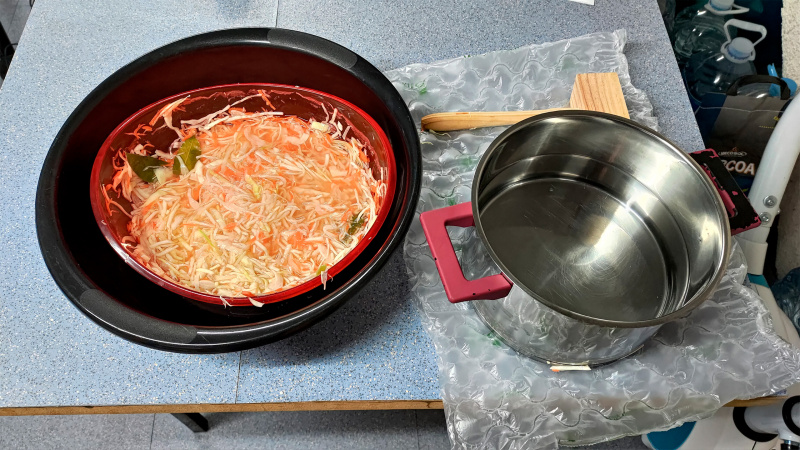 Выбрал самый классический вариант. Нашинковал капусту на немецкой шинковке (она дождалась своего звездного часа), натер морковку, перемешал, слегка промял руками, но не душил, сделал два литра холодного рассола: две столовых ложки соли, черный перец, душистый перец, лаврушка. Сахар, понятное дело, не добавлял. Залил капусту рассолом так, чтобы она была покрыта целиком, сверху поставил гнет - кастрюлю с водой. Миску с капустой поставил в тазик: прочитал, что там уровень жидкости будет подниматься, так что подстраховался, чтобы не залить стол, на котором стоит миска.