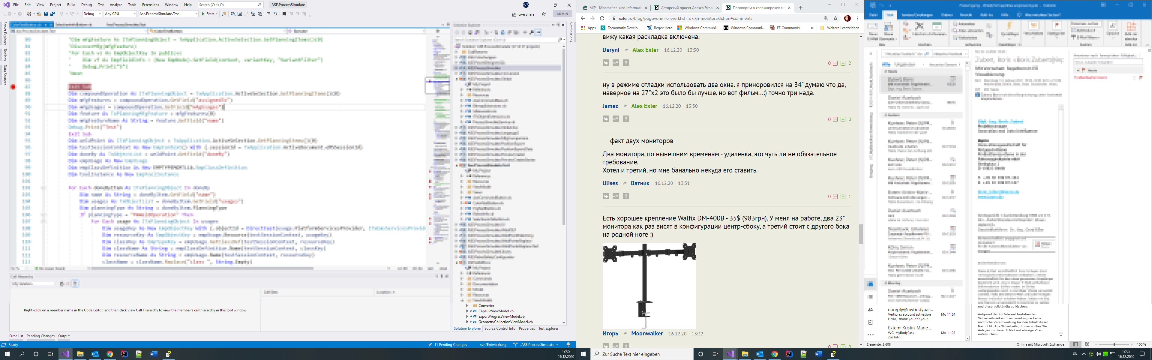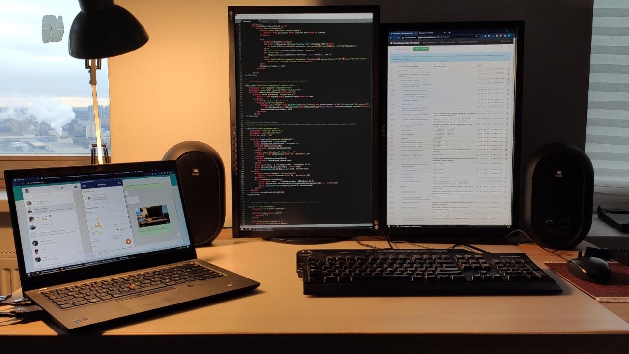 На одном мониторе IDE, на втором - результат того, что в IDE, на третьем документация/почта. Чатик Teams - на айпаде, так как там камера/наушники, и его можно взять на кухню к кофейной машине или прилечь с ним на диван во время видеоконференции.