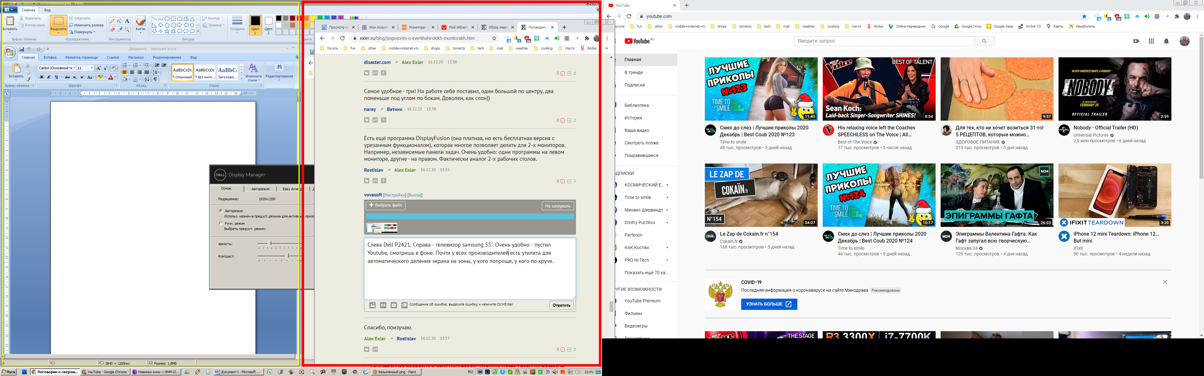 Слева Dell P2421. Справа - телевизор samsung FHD 55". Очень удобно - пустил на телевизоре Youtube, смотришь в фоне. Почти у всех производителей есть утилита для автоматического деления экрана на зоны, у кого попроще, у кого по круче. Можно взять и сверширик, но крутить головой влево и вправо - шея заболит.
