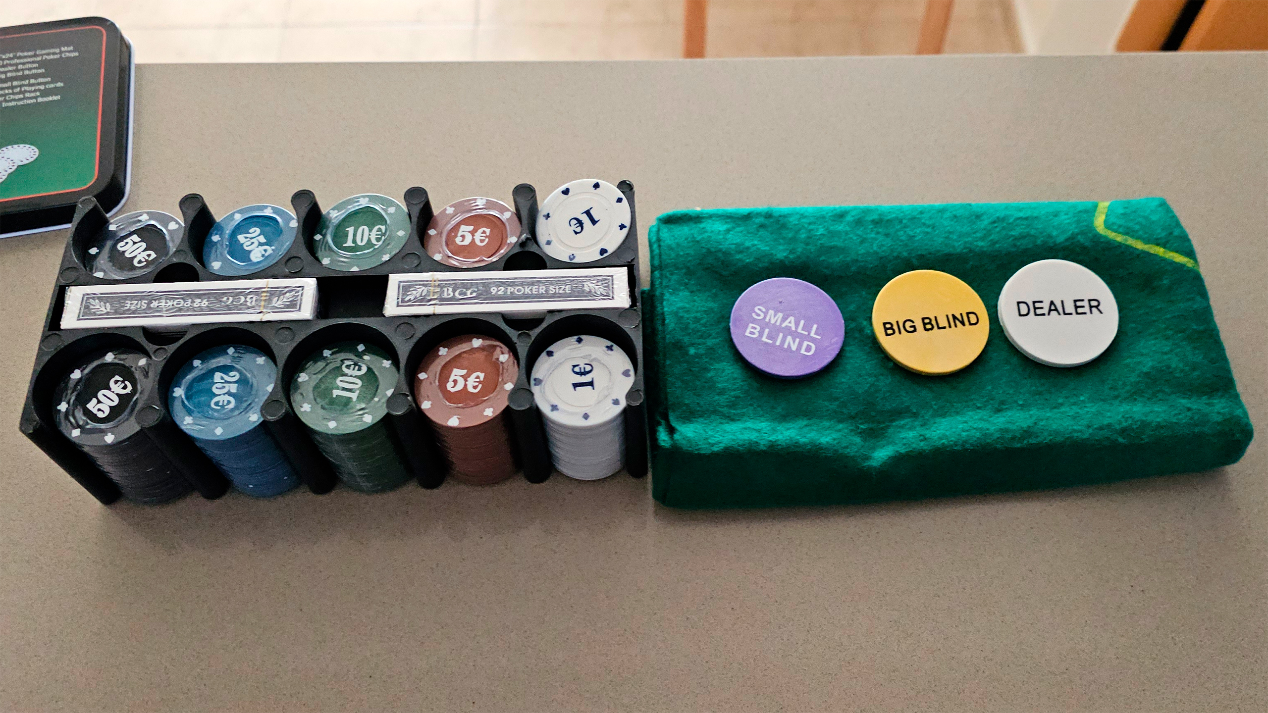 Начинал с такого же комплекта, но поскольку с друзьями хорошо пошло, перешли на набор от Bullets и коврик кошерный. Кстати, у Bullets еще карты правильные - пластиковые с воздушной подушкой, большие цифры по углам, а картинка внутри в рамке и на желтом фоне. Оценивать комбинации очень удобно.
