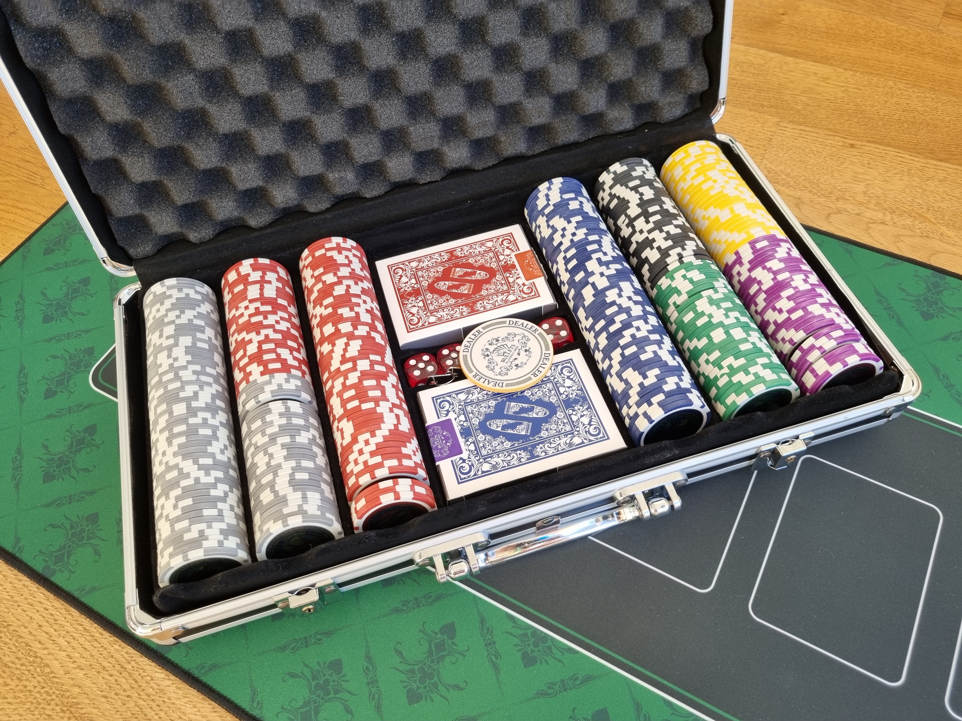 Решил прикупить фишек для покера - и сына обучать, и, может, с друганами в покер перекинемся, а то что-то давно так не развлекались, - зашел в "Амазон" посмотреть, что с этим творится: а там просто море разливанное, на любой вкус! От простеньких домашних наборов до профессиональных: хоть сейчас игорный дом открывай. Взял набор для Texas Hold'em: 200 фишек, сукно, две колоды пластиковых покерных карт, все удовольствие - 18 евро.