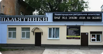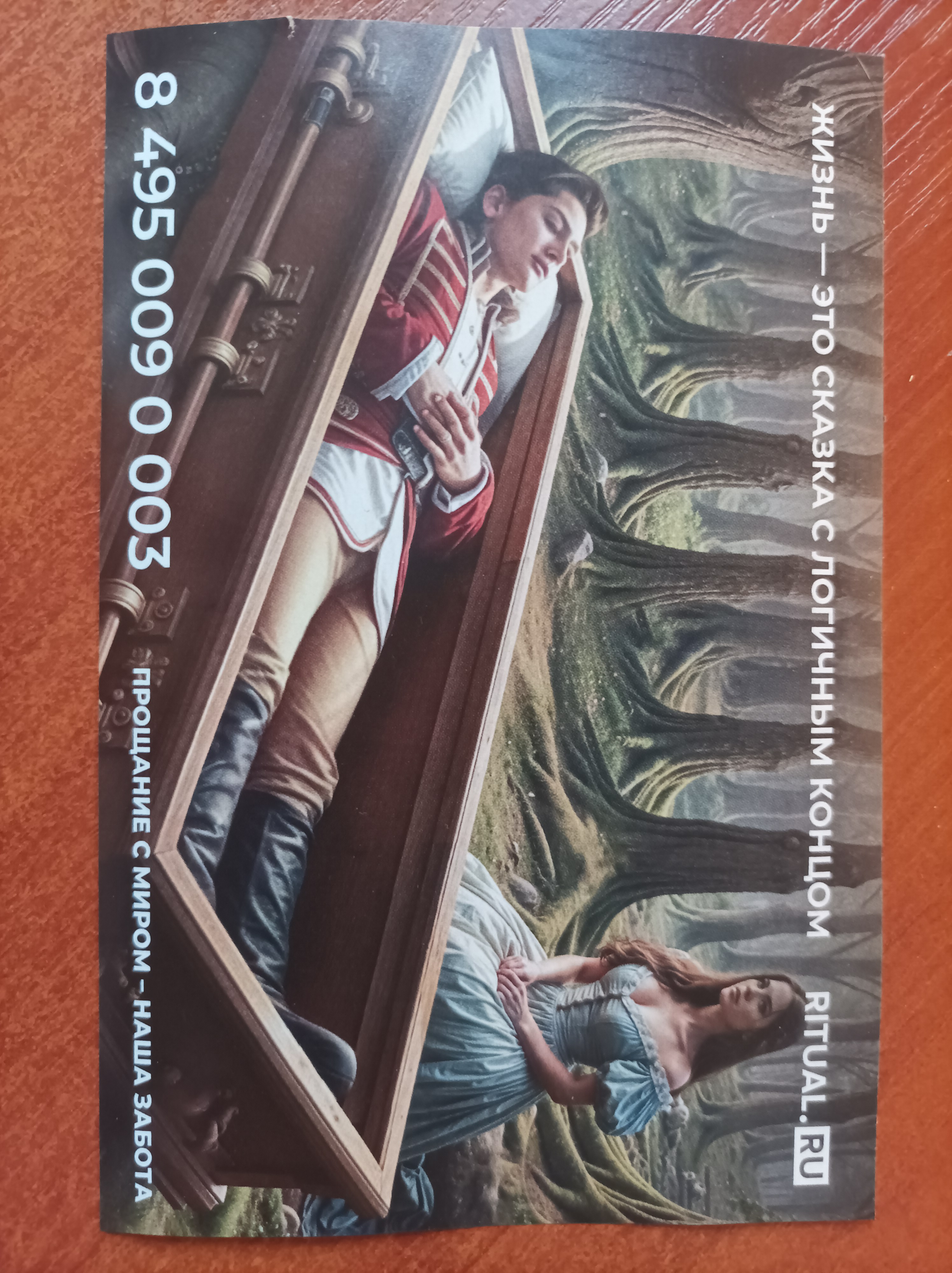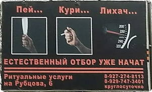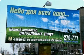 Персонаж одного фельетона Горького поэт Смертяшкин перешел с декадентских мрачных поэм на рекламу и писал "Все у нас вполне блестяще, не потерто, не старо. Заходите к нам почаще в похоронное бюро". Но до такого даже он не додумался.