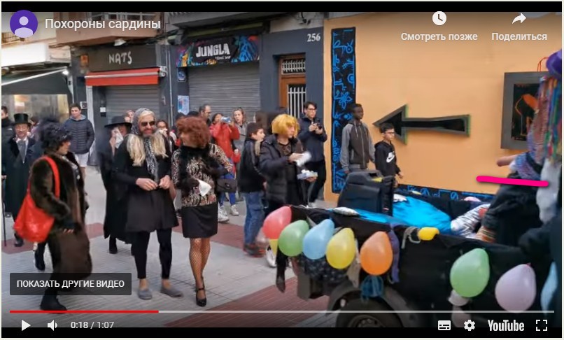 Похороны сардины - праздник, который проводится после традиционного трехдневного карнавала перед наступлением Великого поста. Карнавал, выпивка, еда, веселье, но после этого веселье заканчивается и начинается пост, молитвы и всякое такое. Так почему бы перед постом еще раз не повеселиться, решили испанцы и сделали еще один шуточный праздник. Во время него проводится шествие, в котором в гробу несут сардину, а потом ее торжественно хоронят. При этом повозку с сардиной сопровождают мужчины, одетые "вдовами", и в конце шествия среди них выбирают лучшую "вдову", которая становится типа как королевой праздника.
