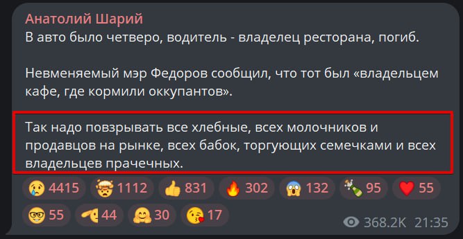 Судя по всему, недолго осталось кататься нашему колобку. Попадёт он лисе на зубок, как пить дать.Хорошо бы ещё и других колобков на подсосе вот так же на чистую воду вывести. Ведь все эти шарии и афиногеновы точно так же виноваты в происходящем, как пригожины и гиркины. И спрос с наёмников пера должен быть не меньше, чем с наёмников ножа и кувалды.