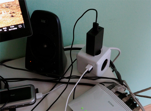 Удобно, что можно подключить через стандартный компьютерный кабель или напрямую в розетку. Защелка для удержания переходников-вилок - фиговая, держит плохо. USB порты выдают заявленные 2А далеко не со всеми устройствами, а если воткнуть сразу два устройства, потребляющих 2А, то ток сильно проседает. Я из-за этого с продавца на алиэкспересс даже компенсацию стряс.