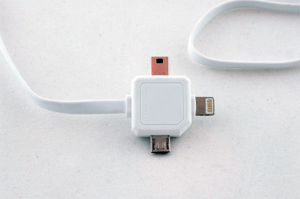 Универсальный USB-кабель с головками lighting, microUSB и miniUSB. А то у меня три разных кабеля на столе болтались (есть устройства с miniUSB и iPad mini), теперь заменил на одно.