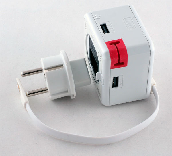 Ну и еще одно любопытное устройство - PowerUSBHub. Это скорее для дороги - многофункциональное устройство. Это powerbank на 4800 мАч с индикатором заряда, адаптер для зарядки 4 устройств по USB, универсальный разъем IEC, позволяющий подключать адаптер к компьютерному кабелю питания, съемная головка адаптера, позволяющая ее менять на соответствующие головки для различных стран. Сменная головка адаптера, кстати, фиксируется специальной защелкой, чего не хватает в Power Cube Travel.