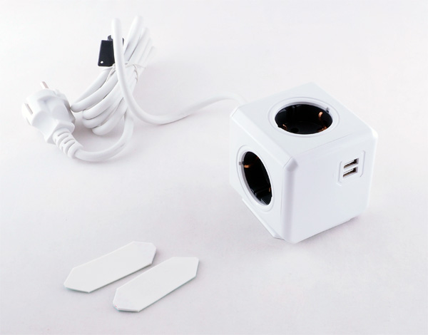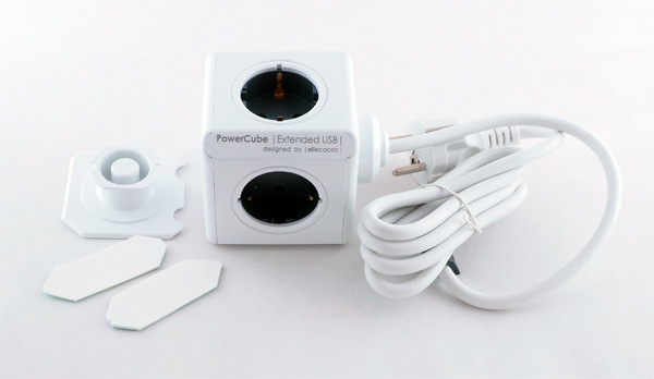 Полутораметровый кабель, четыре розетки, два порта USB, специальный держатель на двухсторонней липкой ленте - закрепить на столе.