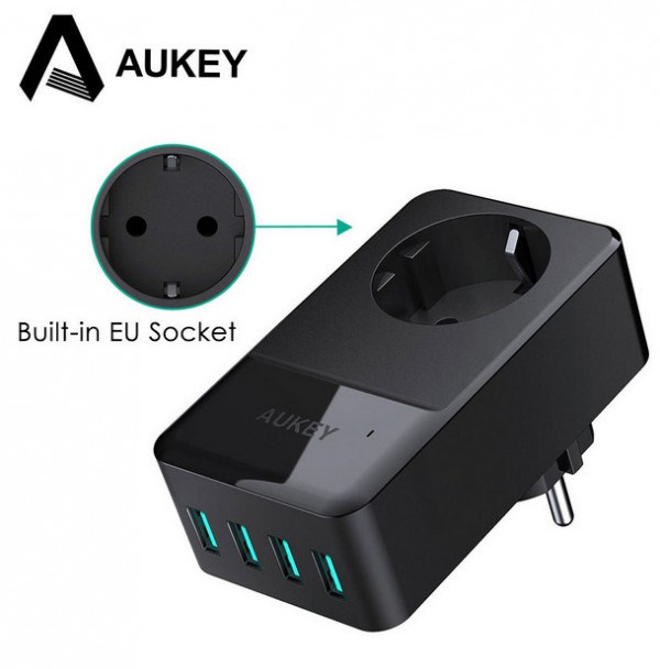 Приехала кое-какая мелочевка. Нашел вот такой удобный адаптер от Aukey. Четырехпортовый зарядник на 5V/2.4A (и вроде бы порты такого цвета у них - поддержка Quick Charge 2, хотя мне сейчас это как раз неактуально) плюс оставляет свободной розетку. Стоит 16 баксов (940 рублей).