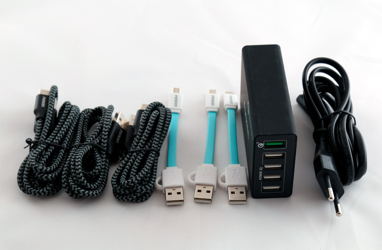 Еще хвалили адаптеры и кабелечке от Fonken - в том же магазине взял пару наборов кабелечков - длинных Type-C и совсем коротких microUSB (часто бывают нужны), - а также зарядник пятипортовик с QC 3.0 - потестировать. Проводочки вроде вполне качественные, "градус" зарядки не крадут. Пятипортовик тоже вполне честно все выдает, да и отзывы на него хорошие.