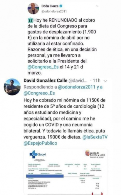 Испанский политик пишет в Твиттере, что свои дополнительные вознаграждения за участие в сессиях и за командировки за месяц, которые не были использованы, он пожертвовал на медицинские нужды. Еще раз - это сверх того, что он получает помимо зараплаты, весьма высокой.